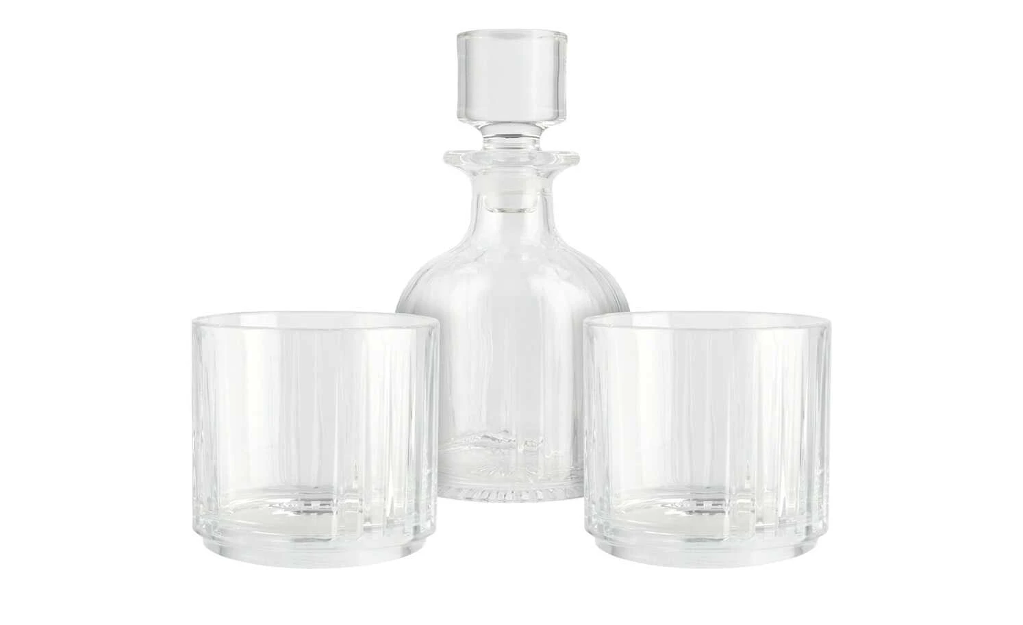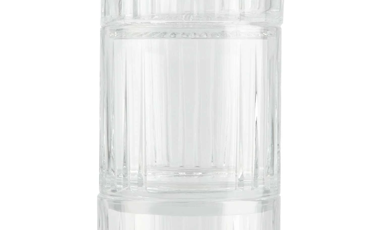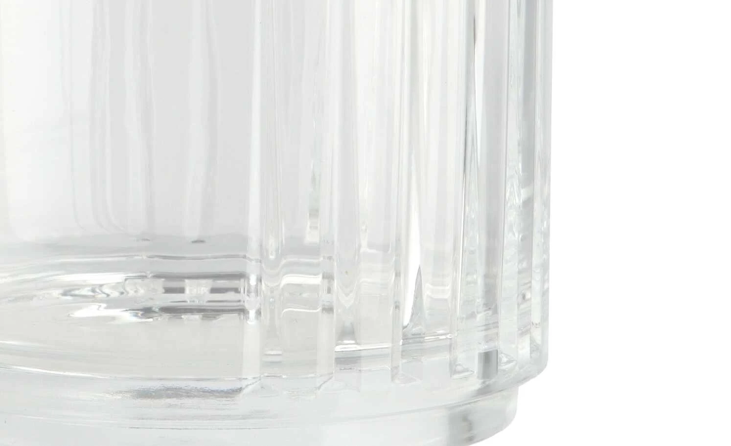Das Set ist aus transparentem Kristallglas gefertigt und besticht mit einem schlichten Streifendesign.