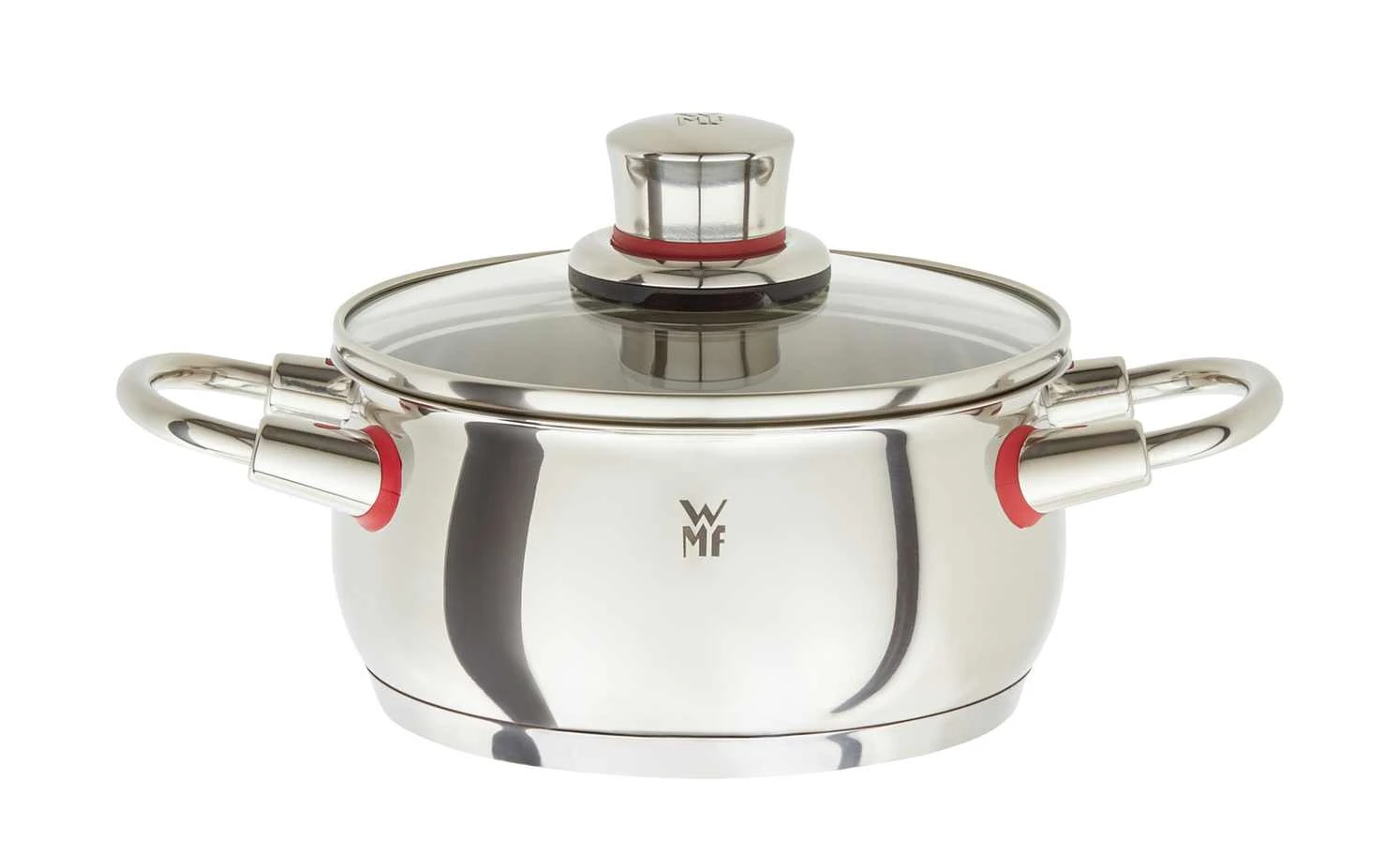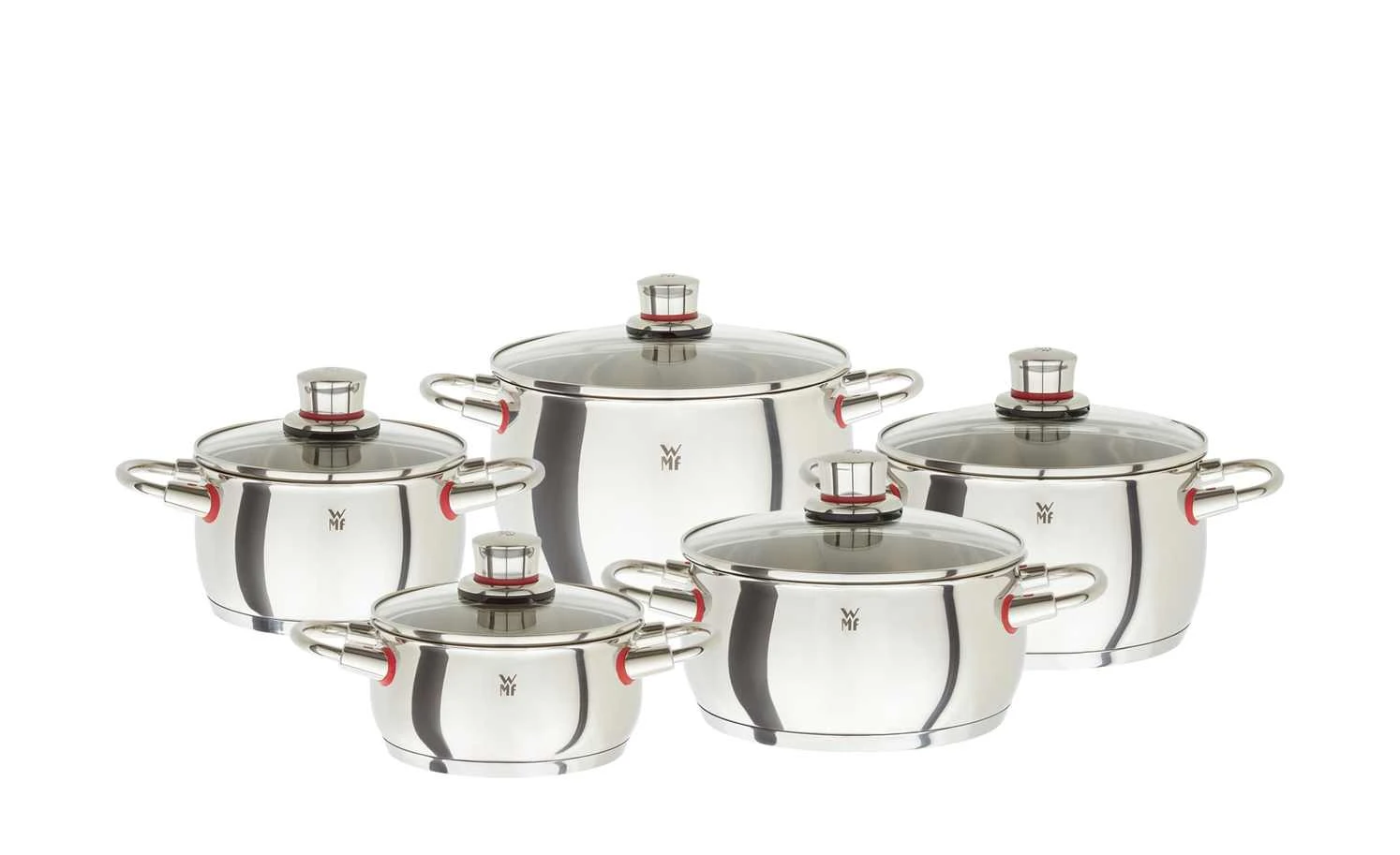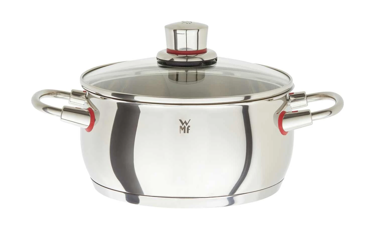 Das Topfset 5-teilig aus der Serie Quality One von WMF ergänzt die moderne Küchenausstattung. Die Töpfe in verschiedenen Größen eignen sich zur Herstellung diverser Gerichte. Während in den größeren Töpfen beispielsweise Braten geschmort wird, kann in einem kleineren Topf eine Beilage wie Reis oder Gemüse garen. Der durchsichtige Deckel dient zur Überprüfung des Garvorgangs. An sanft abgerundeten Knäufen können Sie den Deckel bei Bedarf anheben. Die seitlichen Griffe sind handlich und helfen dabei, den Topf vom Herd an den Esstisch zu transportieren. Rote Verzierungen an den ansonsten glänzend silberfarbenen Töpfen des Ensembles sorgen für eine pfiffige, moderne Note.