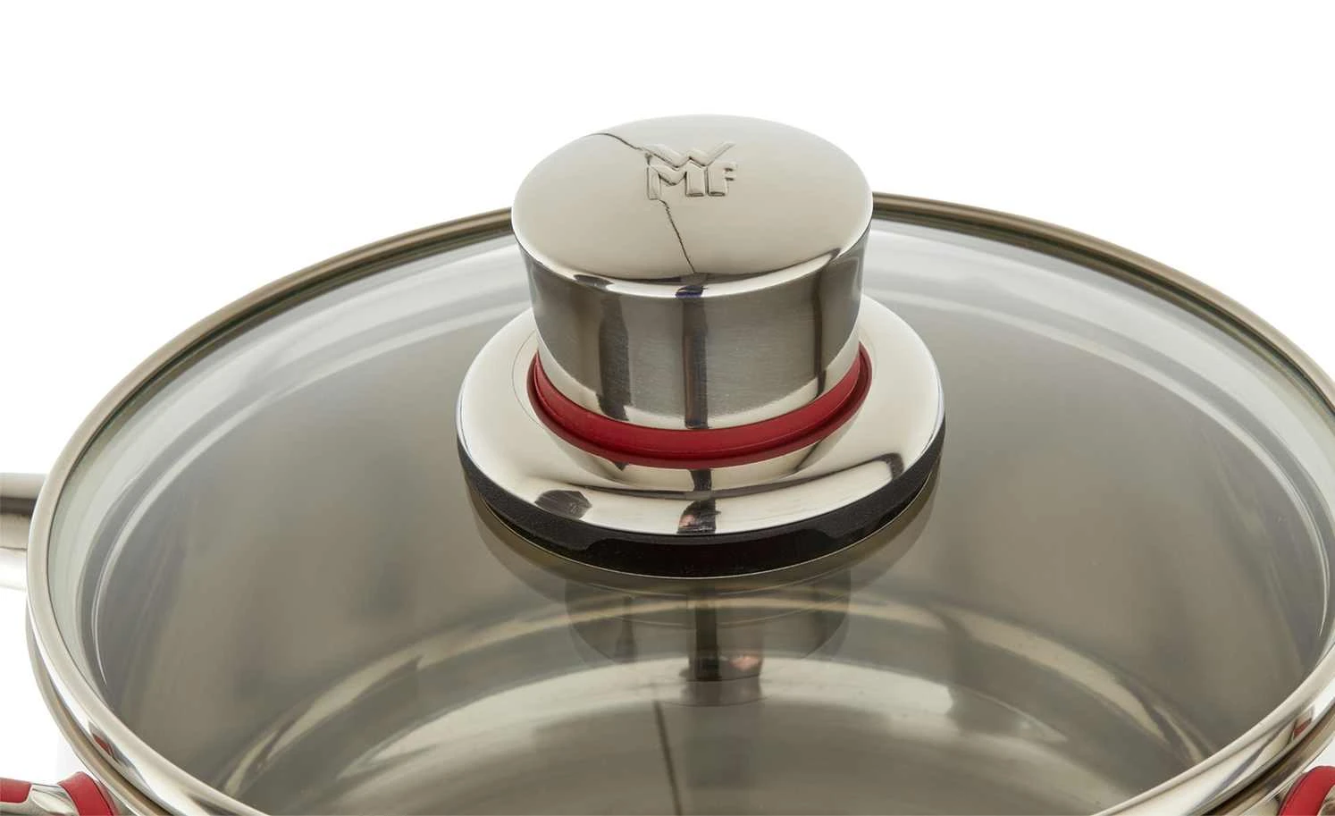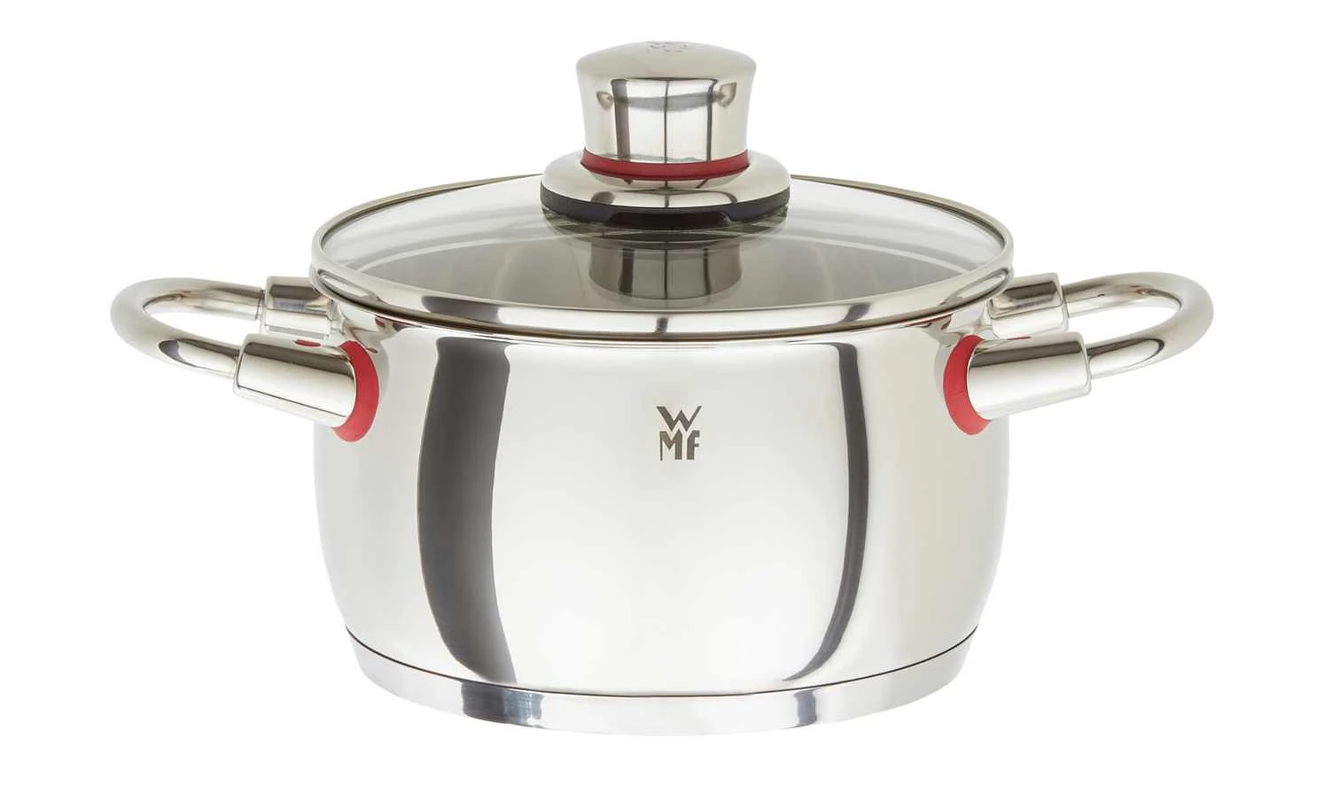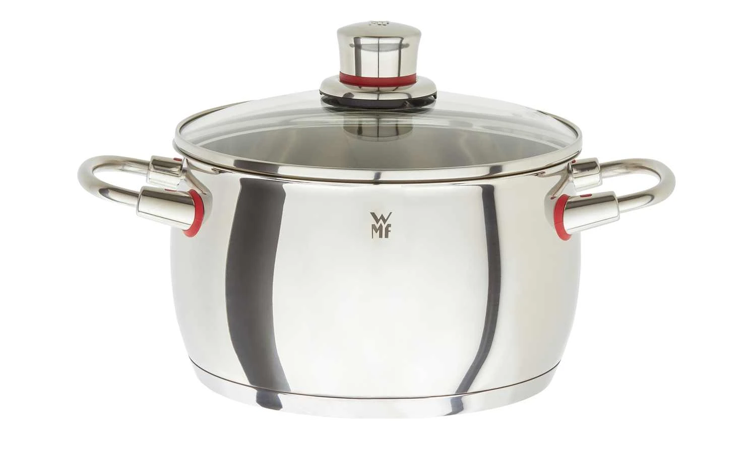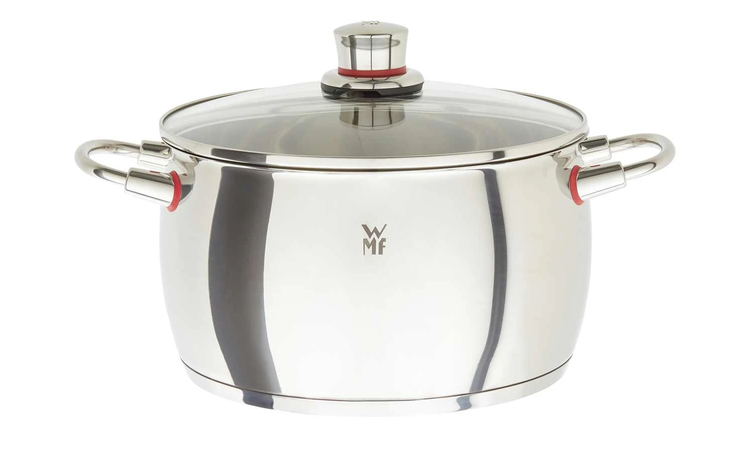 Das Topfset 5-teilig aus der Serie Quality One von WMF ergänzt die moderne Küchenausstattung. Die Töpfe in verschiedenen Größen eignen sich zur Herstellung diverser Gerichte. Während in den größeren Töpfen beispielsweise Braten geschmort wird, kann in einem kleineren Topf eine Beilage wie Reis oder Gemüse garen. Der durchsichtige Deckel dient zur Überprüfung des Garvorgangs. An sanft abgerundeten Knäufen können Sie den Deckel bei Bedarf anheben. Die seitlichen Griffe sind handlich und helfen dabei, den Topf vom Herd an den Esstisch zu transportieren. Rote Verzierungen an den ansonsten glänzend silberfarbenen Töpfen des Ensembles sorgen für eine pfiffige, moderne Note.